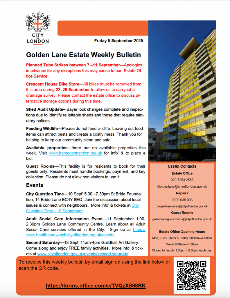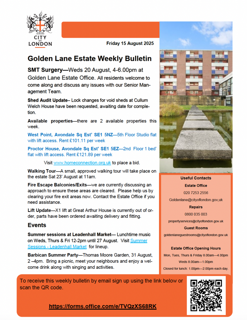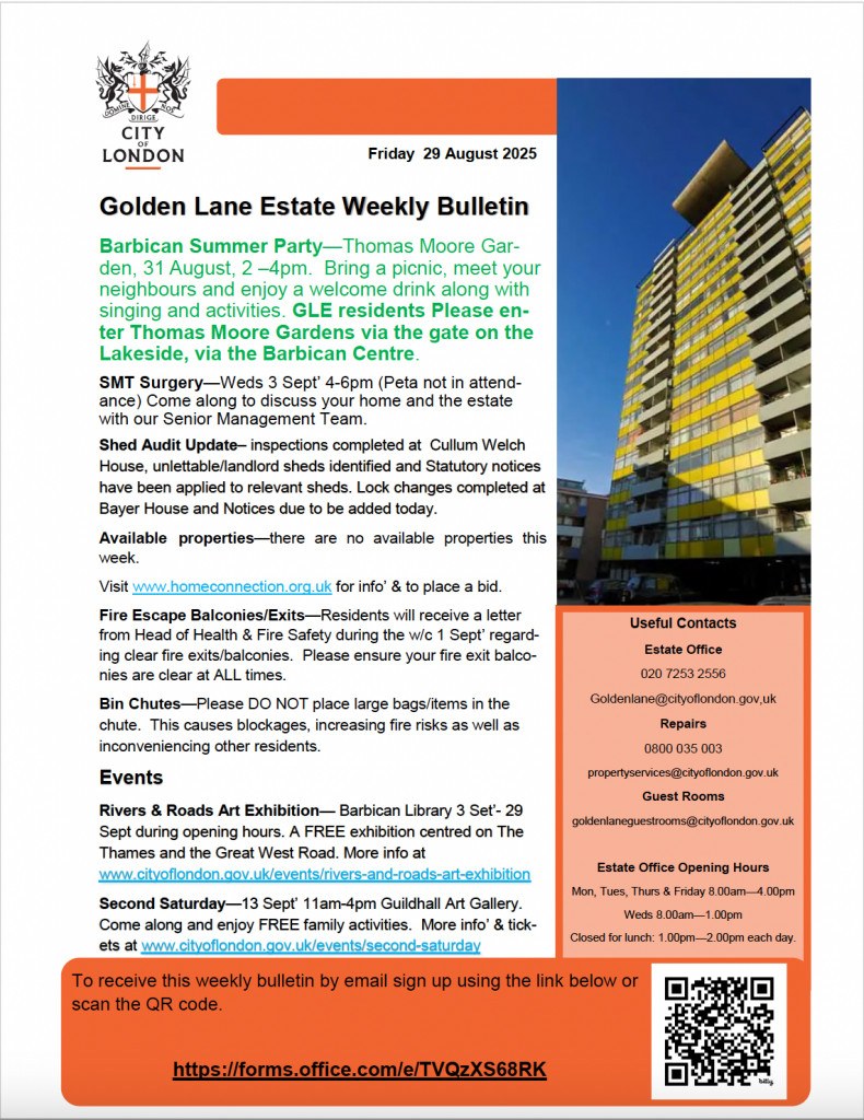 Check the City of London website for dates of walk abouts, drop ins and other estate related info, such as estate services report, fire risk assessment etc