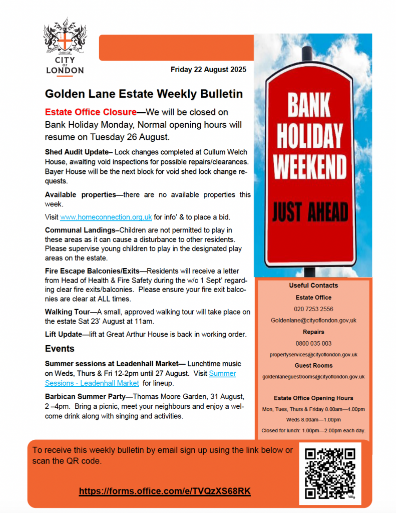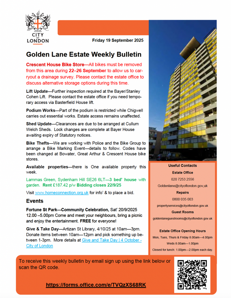 You will find Estate Office weekly bulletins on the noticeboards across the estate and on the window of the Estate Office. GLERA has asked for electronic version – scroll through the gallery below.