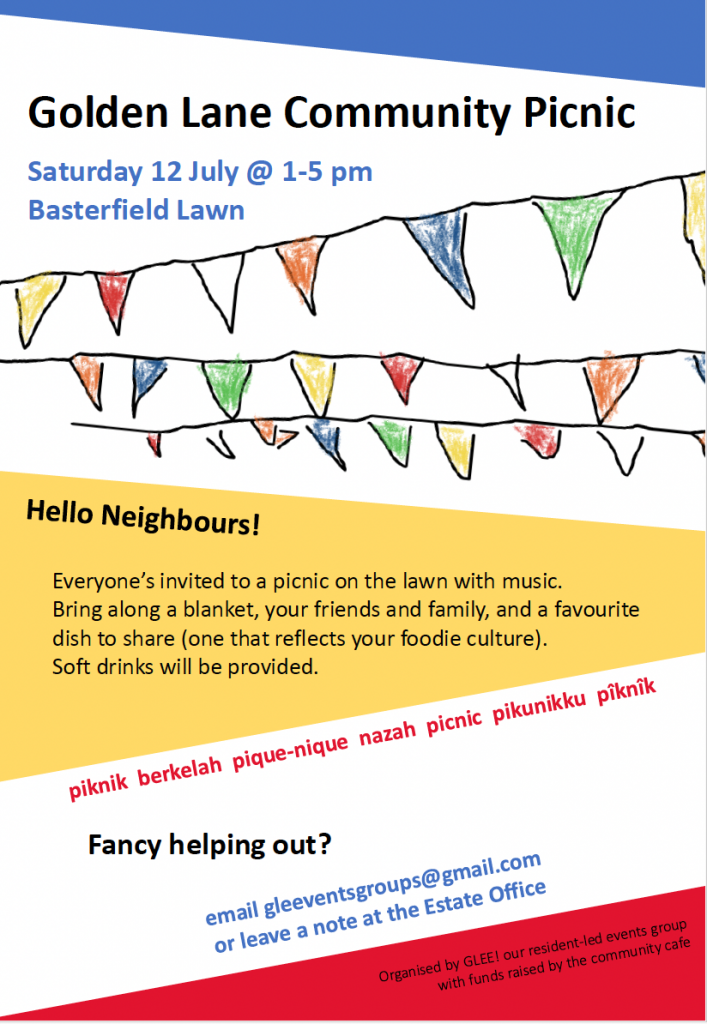 If you’d like to help out there’s lots of ways to get involved: putting up bunting the evening before, setting up chairs and gazebos, helping with food, clearing up… Just get in touch with our residents’ event group !GLEE! gleeventsgroup@gmail.com