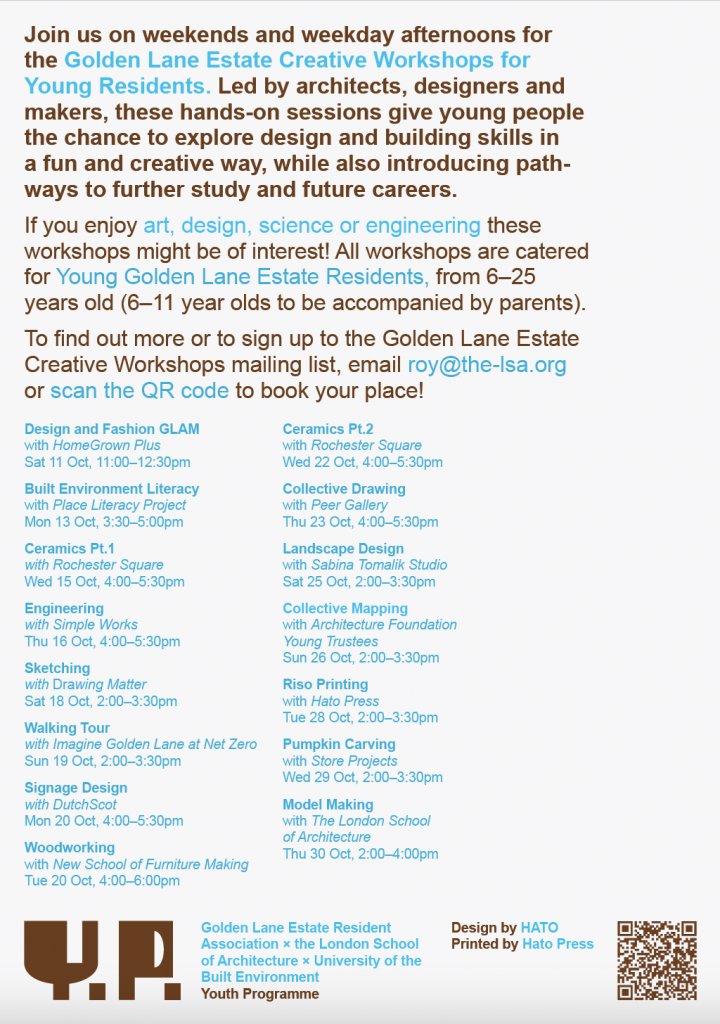 A project for our young people (6-25 years) organised by the London School of Architecture and the University of the Built Environment Youth Programme. 15 creative sessions starting Saturday 11 October – see flyer below for more info.