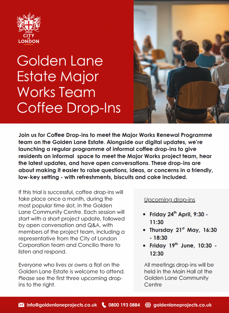 The Golden Lane Estate Major Works Team are trialling informal coffee drop-ins. If they’re successful they will continue on a monthly basis.